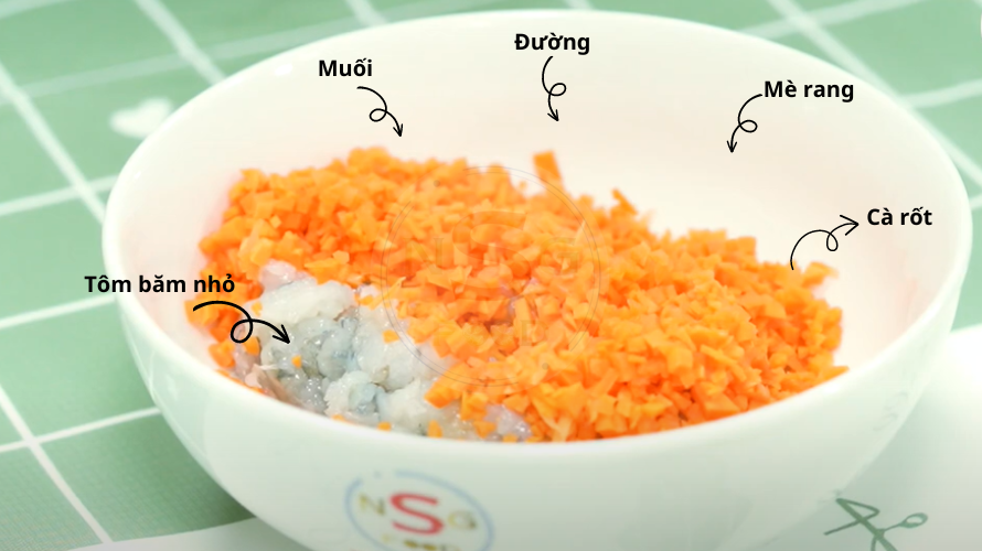 Bạn trộn hết cà rốt và tôm đã sơ chế vào 1 cái tô.
